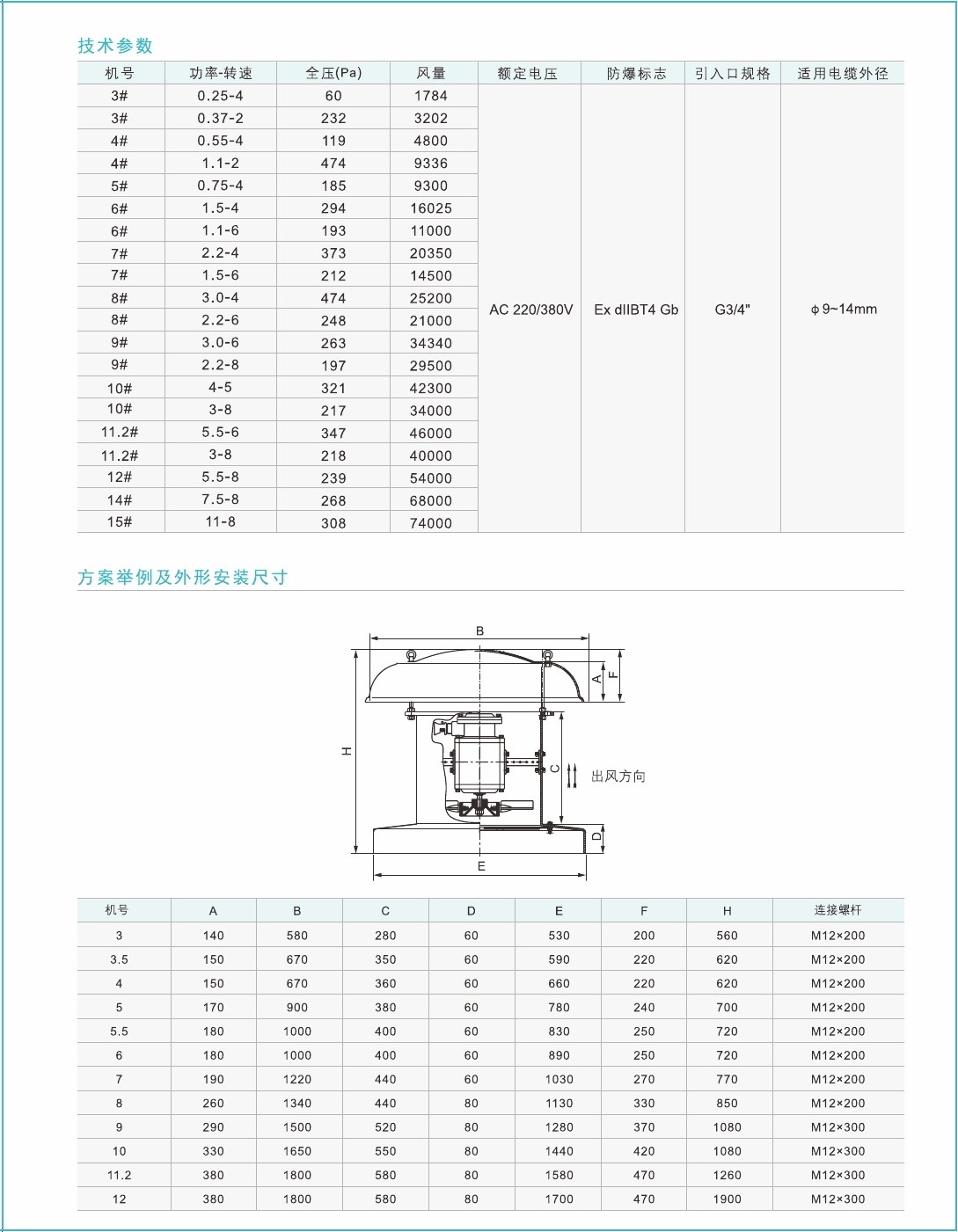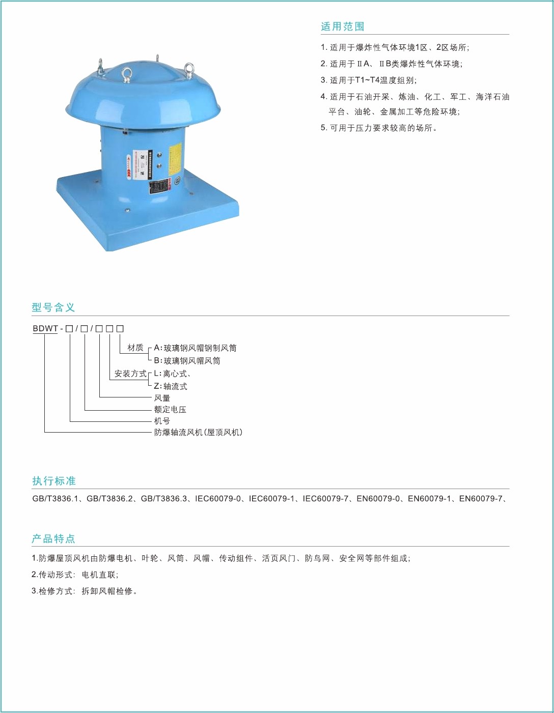 1.防爆屋頂風機由(yóu)防爆電機、葉輪、風筒、風帽、傳動組件、活頁(yè)風門、防(fáng)鳥網、安全(quán)網等部件組成;