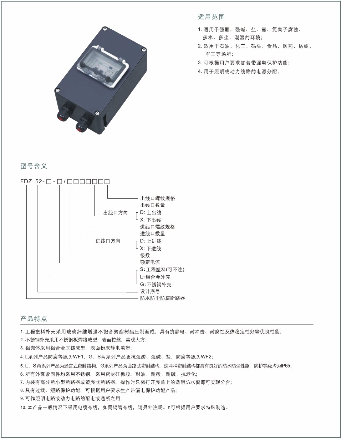 1.工程塑料外殼采用(yòng)玻璃纖維增強(qiáng)不飽合聚酯樹酯壓製而成,具有抗靜電、耐衝擊、耐(nài)腐(fǔ)蝕及熱穩定性好等優良(liáng)性能;