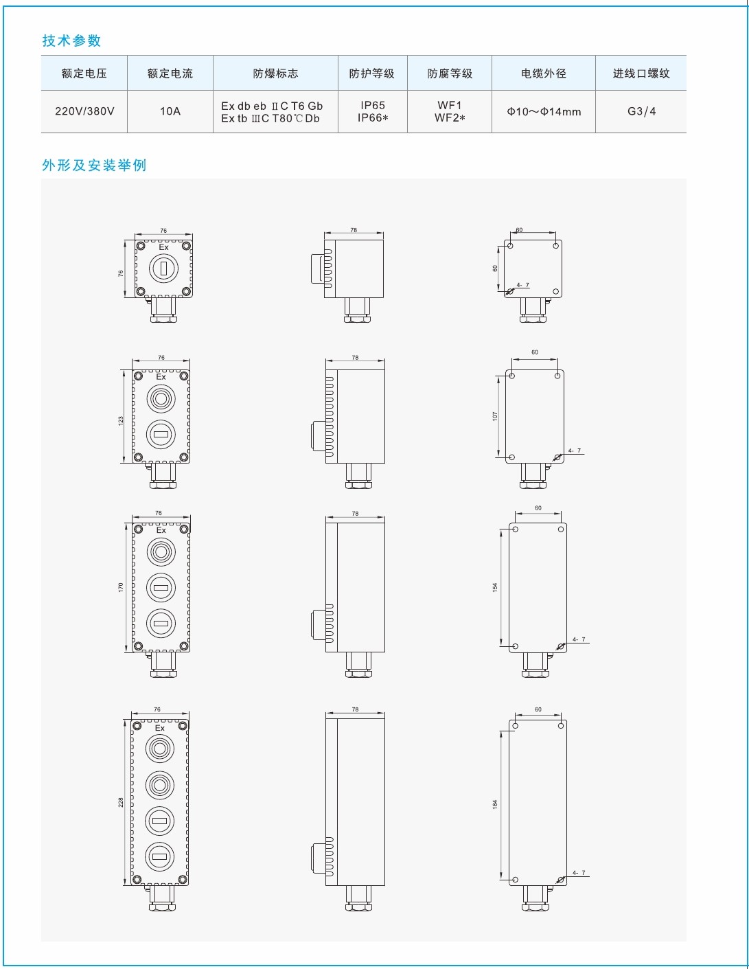 3.本係列產品整(zhěng)體(tǐ)為複合型結構,開關箱采用隔爆型結構(gòu),接線箱采用(yòng)增安型結(jié)構;