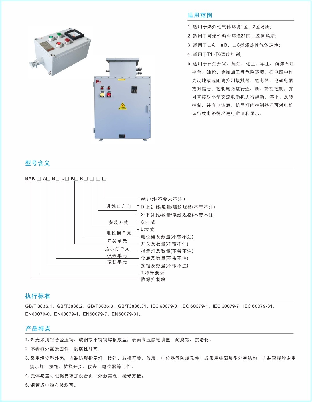 3.采用增安(ān)型外殼(ké),內裝防爆指示燈、按鈕、轉換開關、儀表、電位器(qì)等防爆元件;或采用純隔爆型外殼結構,內裝隔爆腔專(zhuān)用指(zhǐ)示燈、按鈕、轉換開關、儀(yí)表、電位器等元件。